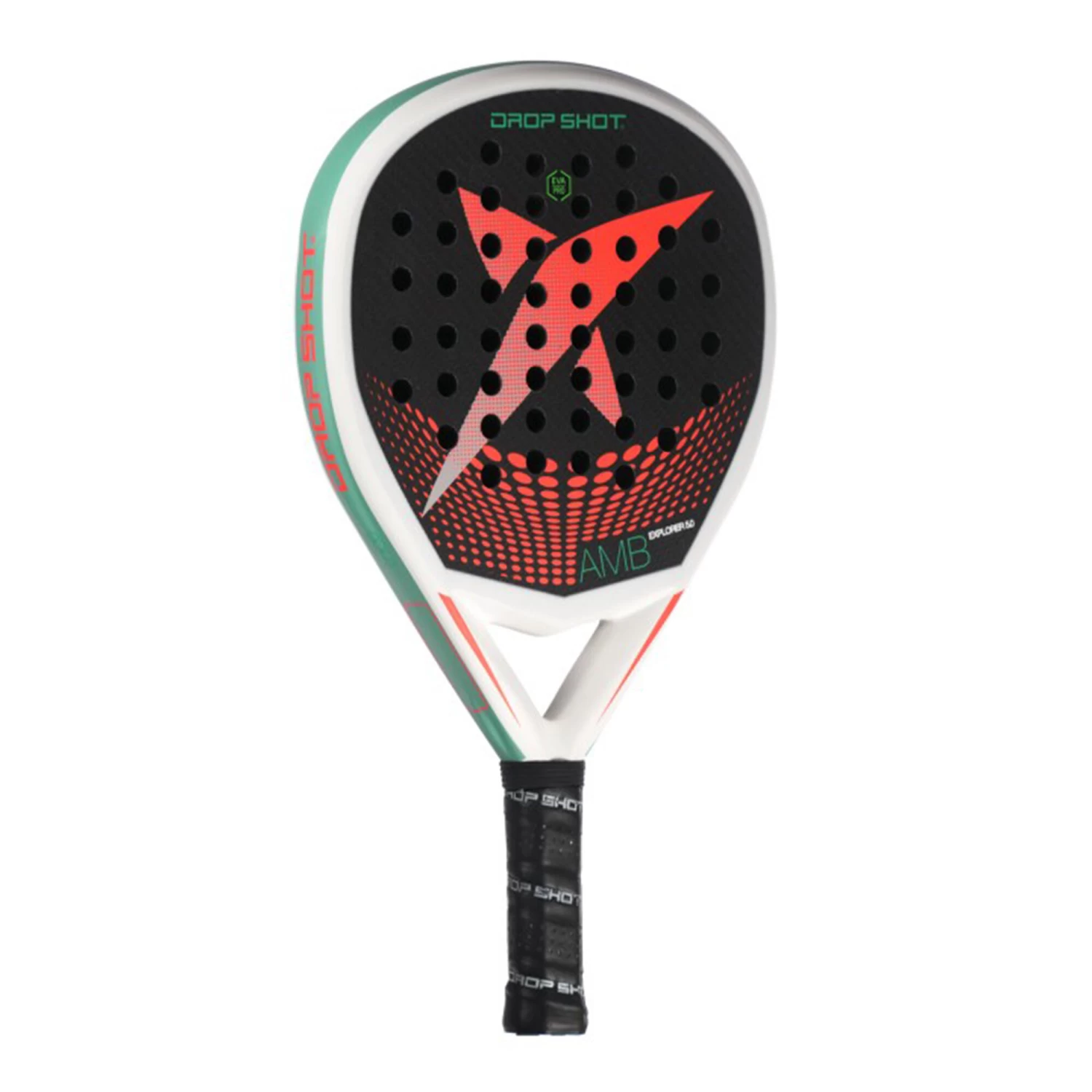 – Rubber: Eva soft. Rubber with great elasticity and lightness, which provides greater ball output and a wider sweet spot with greater comfort when playing. Drop Shot rackets with Eva Soft rubber has great vibration absorption.