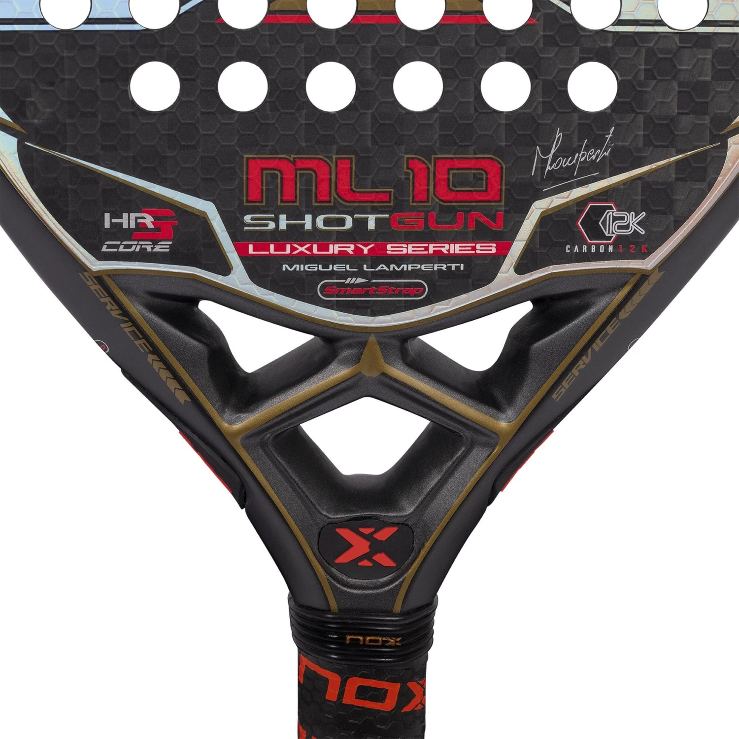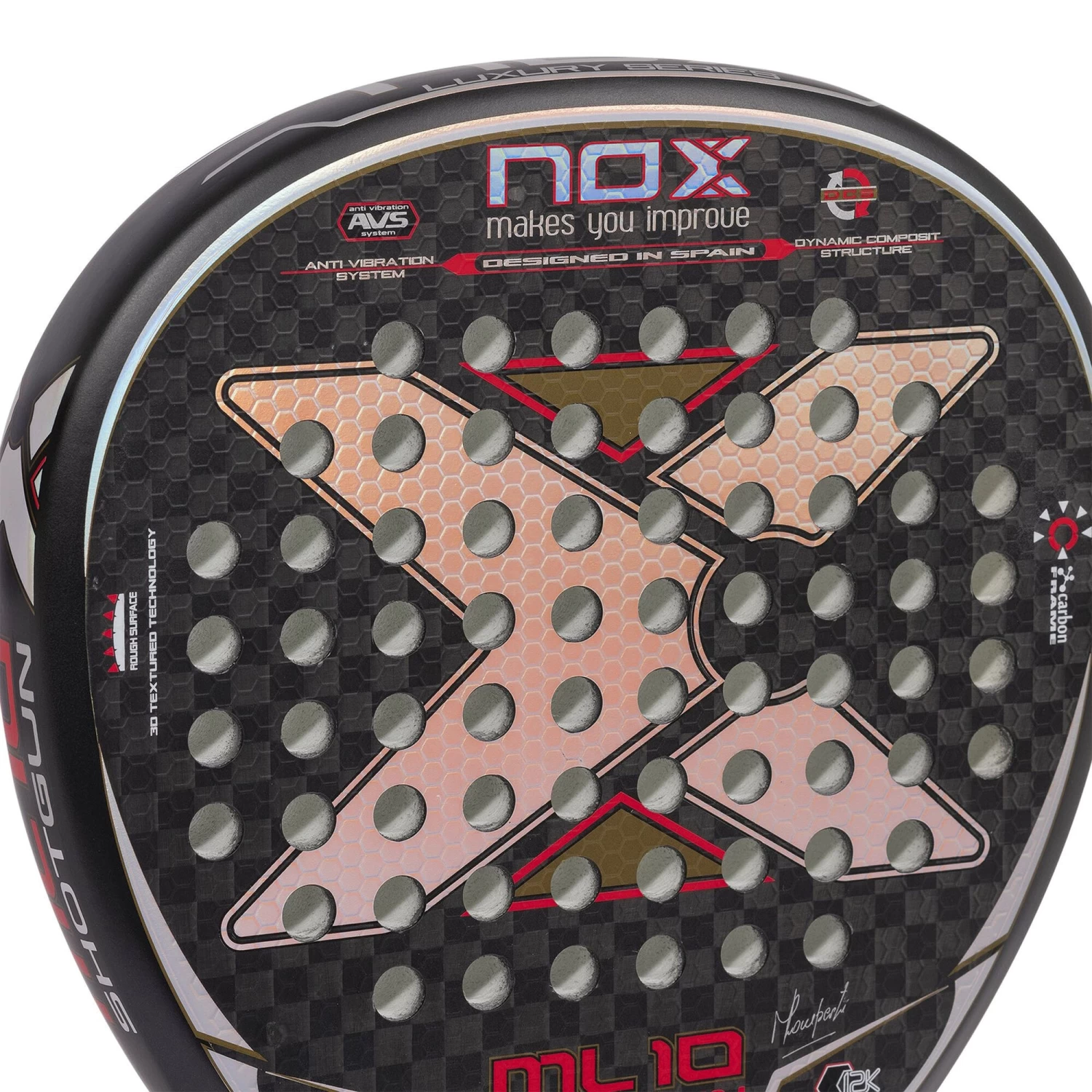 The ML10 Luxury Shotgun is a racket that offers great power and great control in the game. It combines the diamond frame to generate more power when smashing with the 12K carbon surfaces and high-density HR3 rubber, for more powerful hits. In addition, it incorporates the AVS anti-vibration system and rough surfaces to help hitting with high spin.
