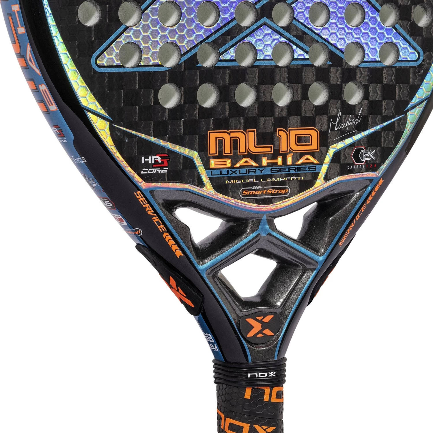 The 12K weave is achieved by interlacing the carbon fiber threads into small squares. The surfaces of the racket are composed by a 12K carbon fiber that will increase its hardness and durability. This material nourishes the racket with a harder touch that is translated into greater power and explosiveness when hitting.
