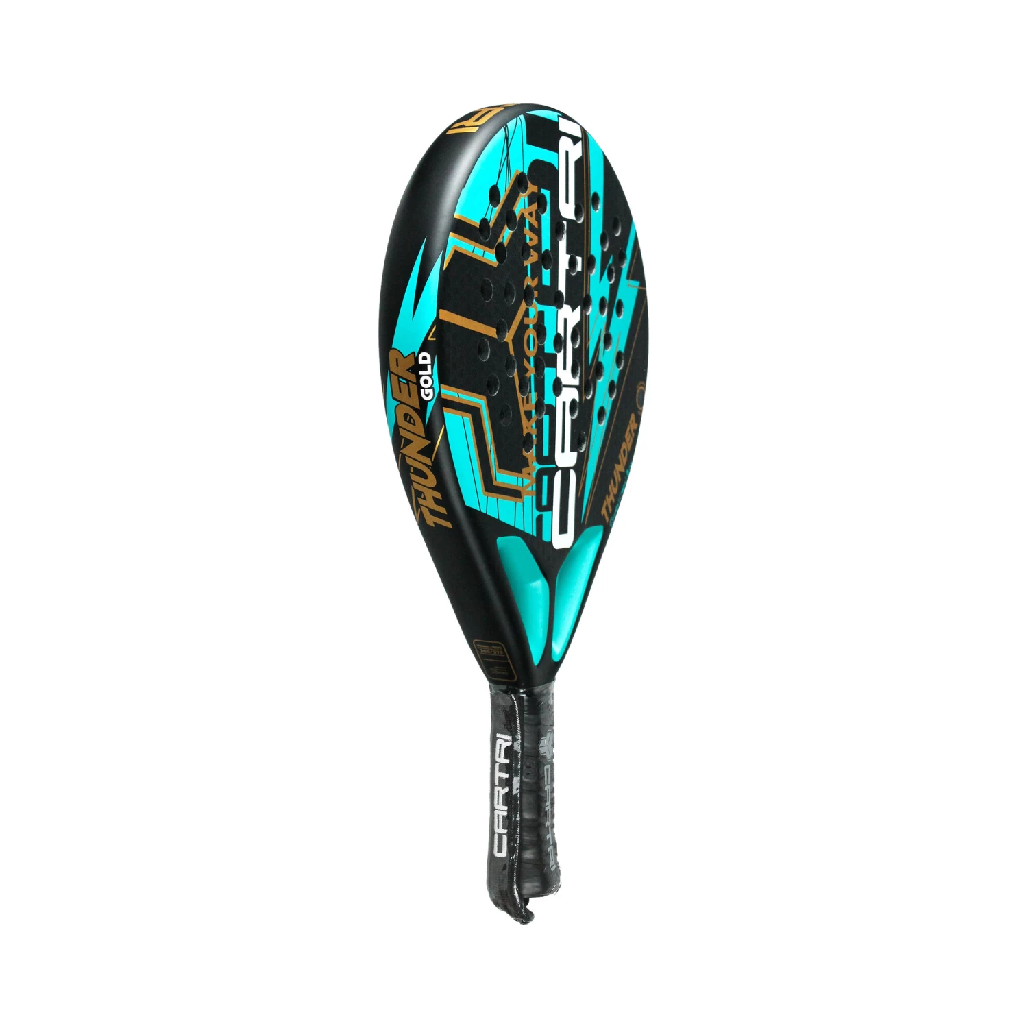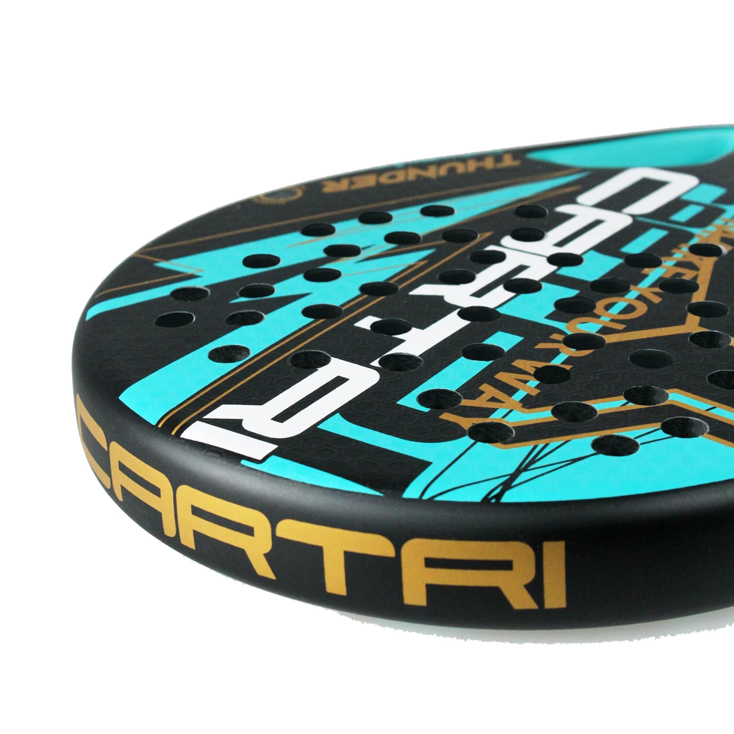 The new Thunder Gold padel racket is a teardrop-shaped racket with in a mid-high balance. It is composed of hybrid faces of Carbon Aluminium and Carbon, and the core of Eva Soft Black rubber. This composition allows to have a good ball output while maintaining a high level of precision in the strokes. The frame of the racket is 100% carbon, providing greater rigidity and durability, and at the same time reducing the vibrations of the blade.