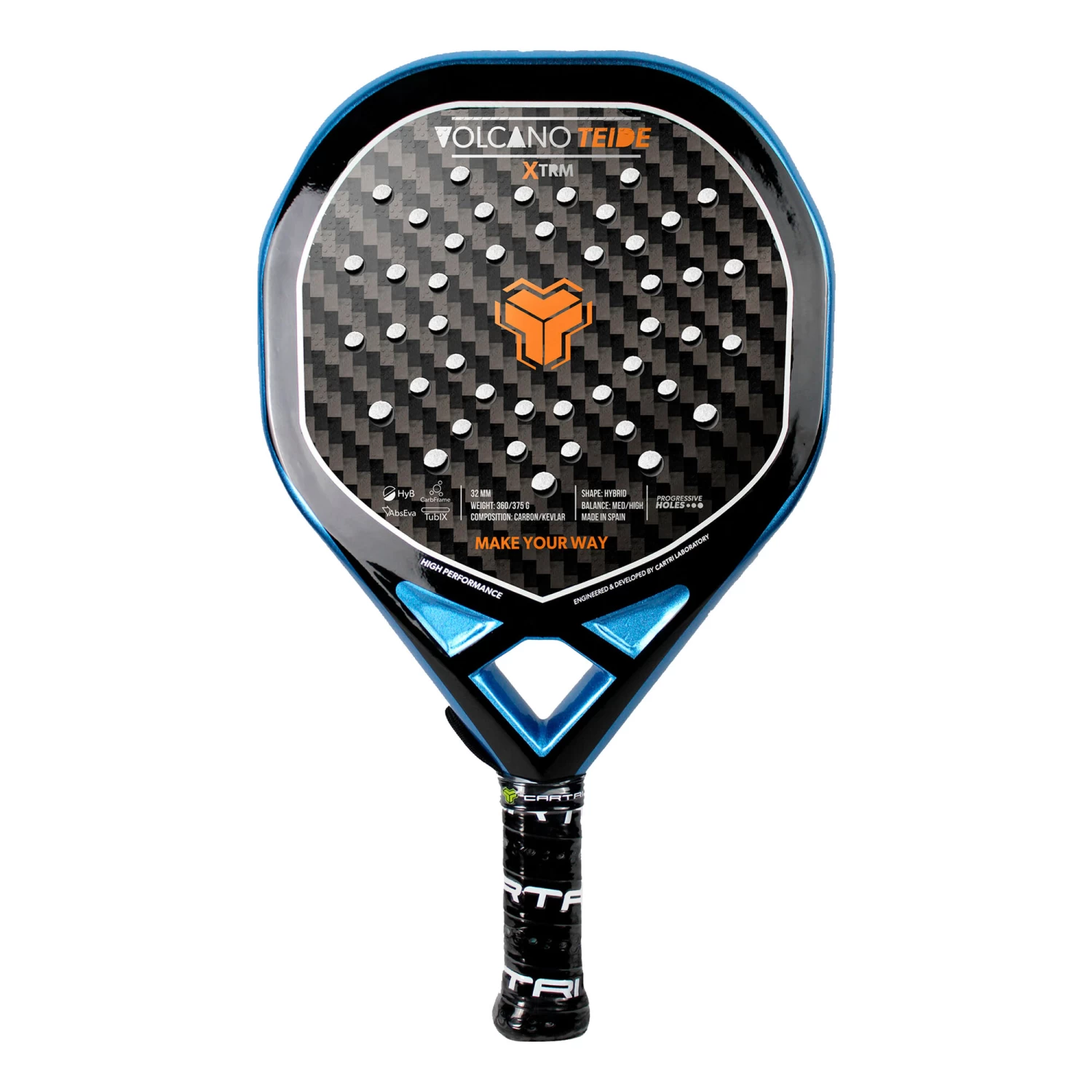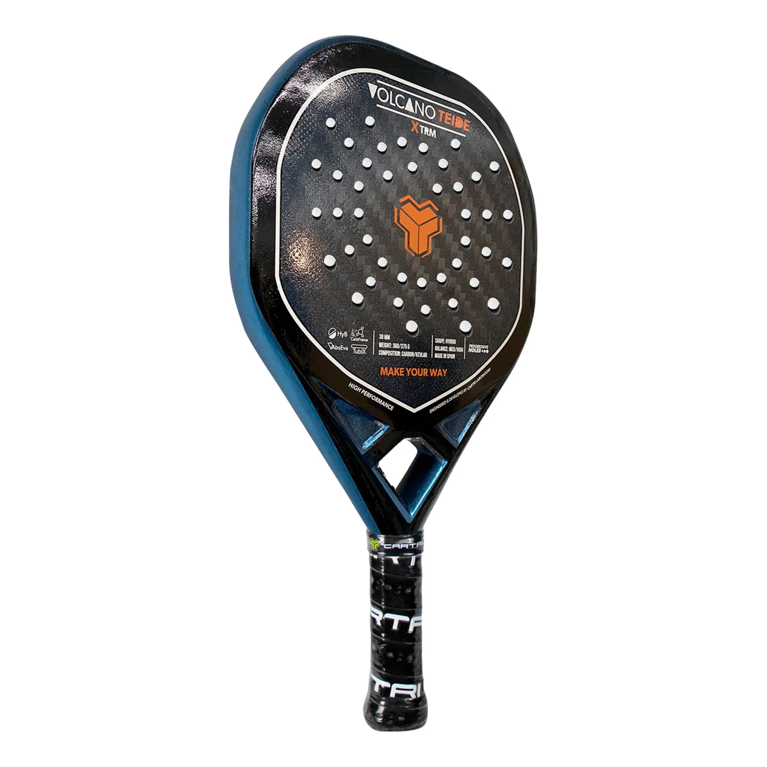 The new Volcano Teide padel racket is a hybrid-shaped, medium-balanced padel racket with a wide sweet spot. The racket is composed of faces with 12K Carbon layers and a core with a hybrid between Foam Med White and Eva Soft Black rubbers. The unification of these materials provides a sweet ball touch with a high level of precision and power. The frame of the racket is not an aspect that we should stop overlooking, it is composed of a hybrid between Kevlar and Carbon 6K. This is characterized by its high rigidity and durability, thus allowing to reduce the vibrations of the racket and guarantee a better playing sensation, more comfortable. However, the Volcano Teide padel racket not only stands out for the use of high quality materials, it is also worth highlighting its design and high levels of finishes.
